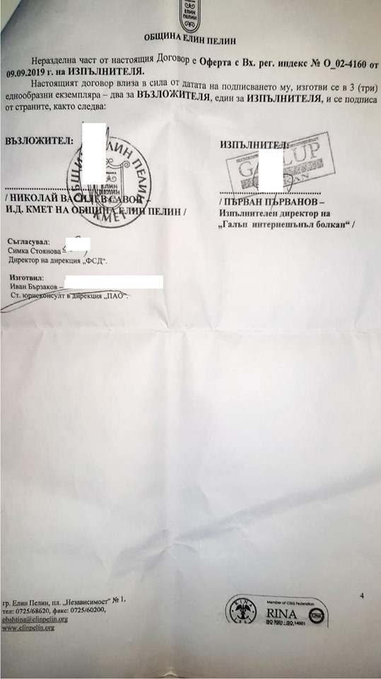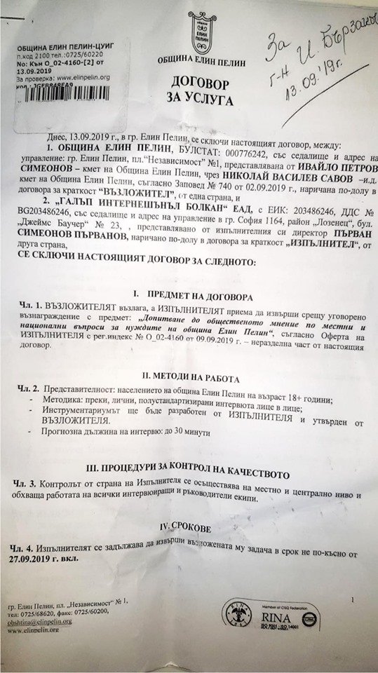 Социологическата агенция "Галъп", която се прочу със съмнителни предизборни данни, целящи да накланят везните в една конкретна посока, дърля общините за пари, става ясно от договор с община Елин Пелин, с който ПИК се сдоби. През септември районното кметство е сключило договор с прочутия политолог от агенцията Първан Симеонов за 10 хиляди лева, без да е ясно за какво са му тези пари на Елин Пелин и какво е нужно да се мери там.