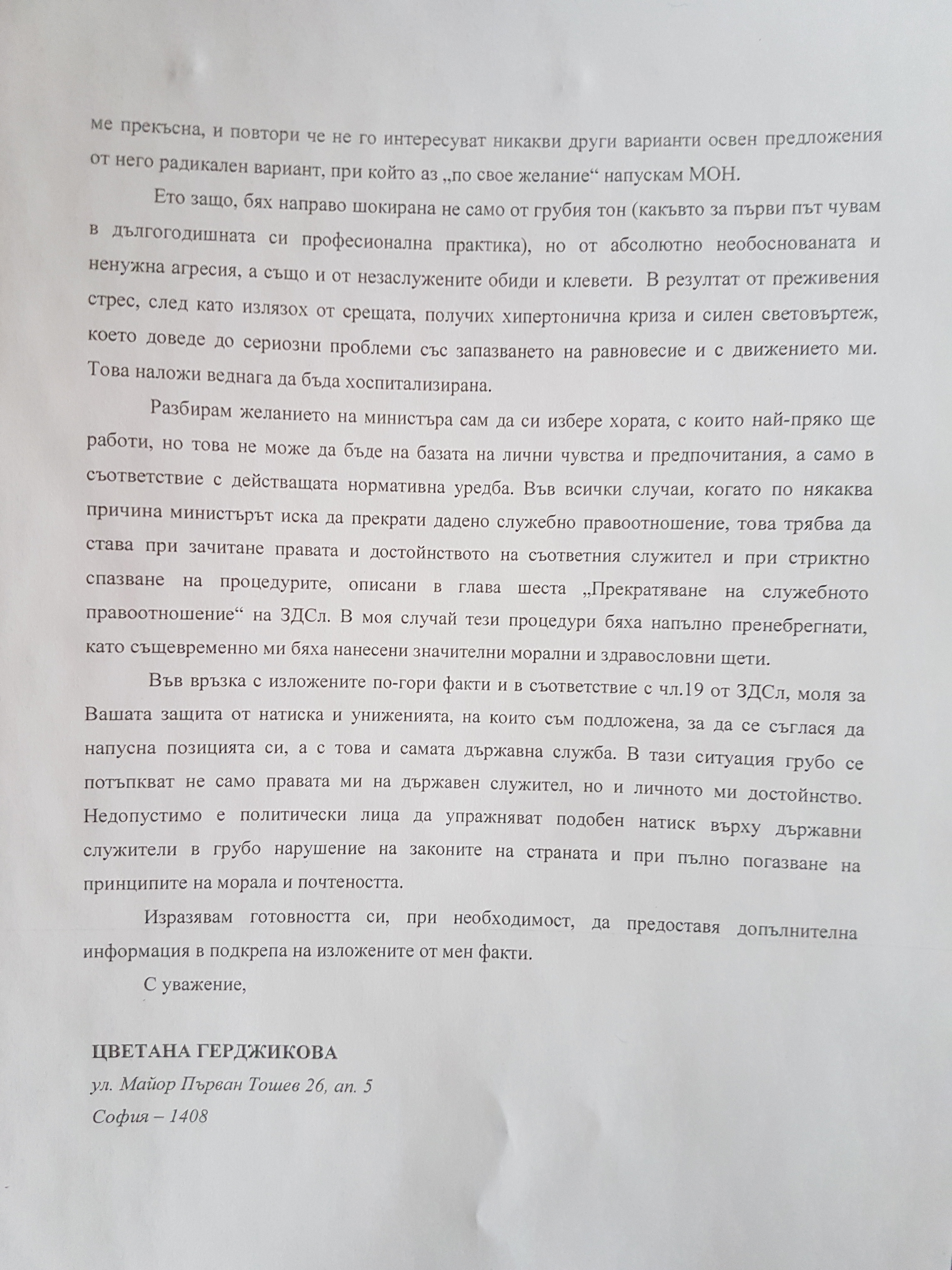 Цветана Герджикова е била шокирана не само от грубия тон на новия министър, но и от абсолютно необоснованата и ненужна агресия, а също и от незаслужените обиди и клевети. В резултат от преживения стрес след срещата, тя е получила хипертонична криза и силен световъртеж, поради което е постъпила в болница. Държавният служител моли служебния премиер Огнян Герджиков да защити администрацията от натиска и униженията, за да напускат позициите си. "Недопустимо е политически лица да упражняват подобен натиск върху държавни служители в грубо нарушение на законите на страната и при пълно погазване на принципите на морала и почтеността", допълва Цветана Герджикова.
