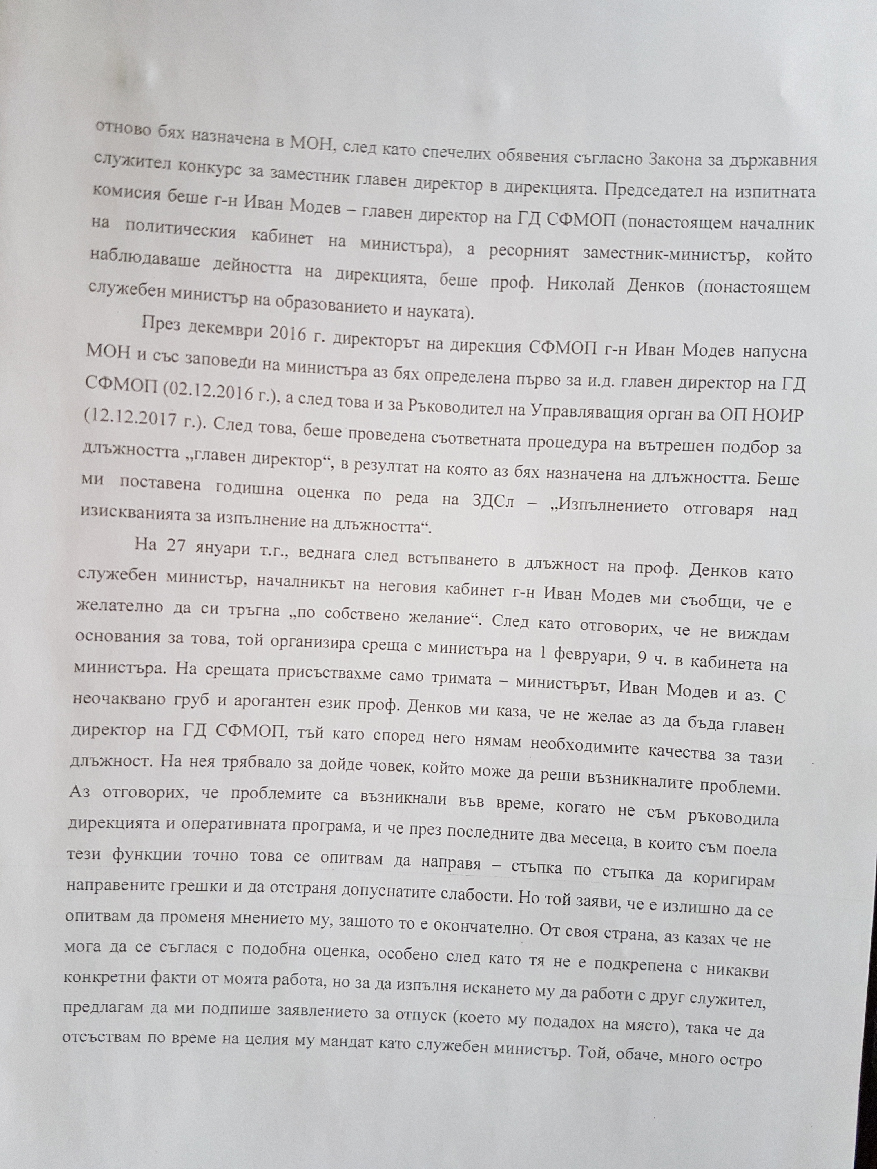 И продължава: "Аз отговорих, че проблемите са възникнали във време, когато не съм ръководила дирекцията и оперативната програма и че през последните два месеца, в които съм поела тези функции точно това се опитвам да направя - стъпка по стъпка да коригирам направените грешки и да отстраня допуснатите слабости. Но той заяви, че е излишно да се опитвам да променя мнението му, защото е окончателно. От своя страна, аз казах че не мога да се съглася с подобна оценка, особено след като тя не е подкрепена с никакви конкретни факти от моята работа, но за да изпълня искането му да работи с друг служител, предлагам да ми подпише заявлението за отпуск, така че да отстъствам по време на целия му мандат като служебен министър. Той обаче повтори, че не го интересуват никакви други варианти освен предложения от него радикален вариант, при който аз по свое желание напускам МОН".
