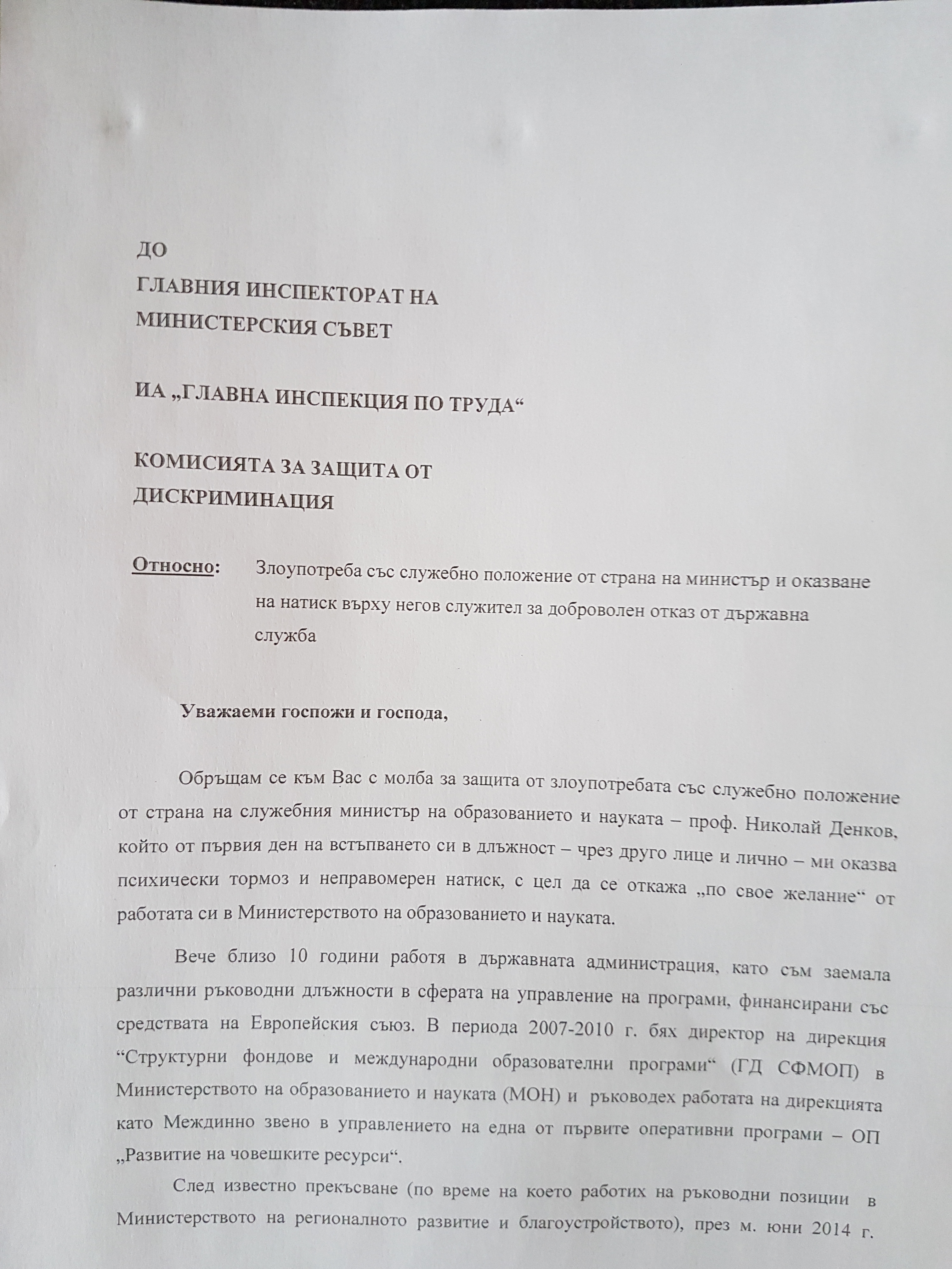 Срещу новия министър вече има подаден сигнал от Цветана Герджикова, директор на дирекция "Структурни фондове и международни образователни програми" в МОН, научи ПИК. Сигналът е до Главния инспекторат на Министерския съвет, Главна инспекция по труда и Комисията за защита от дискриминация и разполагаме с него.