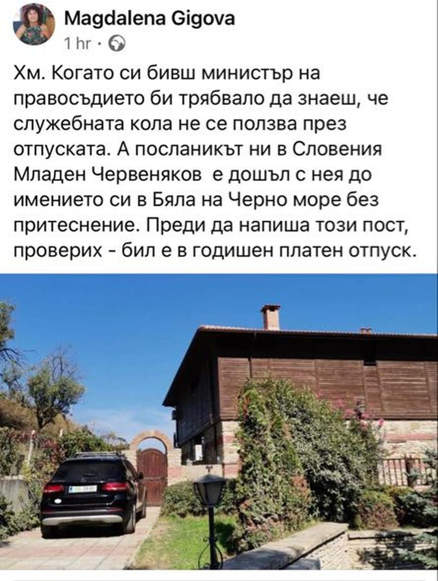 "Хм. Когато си бивш министър на правосъдието би трябвало да знаеш, че служебната кола не се ползва през отпуската. А посланикът ни в Словения Младен Червеняков е дошъл с нея до имението си в Бяла на Черно море без притеснение. Преди да напиша този пост, проверих - бил е в годишен платен отпуск.", написа журналистката в профила си във Фейсбук.