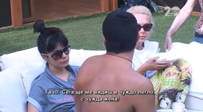 Въпреки забележката на певицата Тачо не спря с флирта. "Кучкова, как не те срещнах по-рано... трябва ми само час без камери!".
