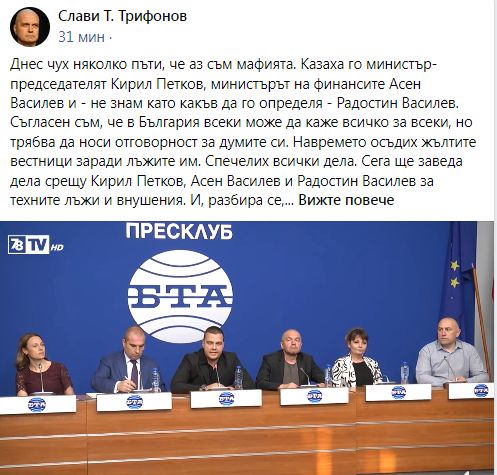 Днес чух няколко пъти, че аз съм мафията. Казаха го министър-председателят Кирил Петков, министърът на финансите Асен Василев и - не знам като какъв да го определя - Радостин Василев. Съгласен съм, че в България всеки може да каже всичко за всеки, но трябва да носи отговорност за думите си.