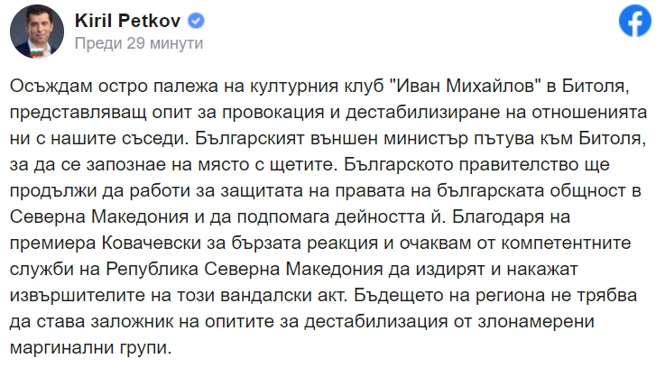 След близо 8 часа Кирил Петков „осъди“ палежа на Културния център „Иван Михайлов“ в Битоля. Във Фейсбук премиерът определи това като „опит за провокация и дестабилизиране на отношенията ни с нашите съседи“.