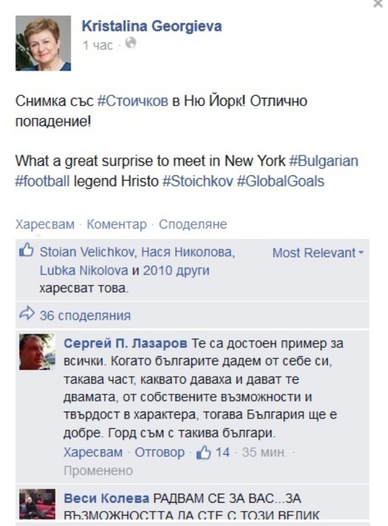 "Снимка със #Стоичков в Ню Йорк! Отлично попадение!". Това написа еврокомисарят Кристалина Георгиева в социалната мрежа Фейсбук под снимка с Христо Стоичков. Оказва се, че тя случайно се е срещнала със звездата на българския футбол на улица в Ню Йорк.