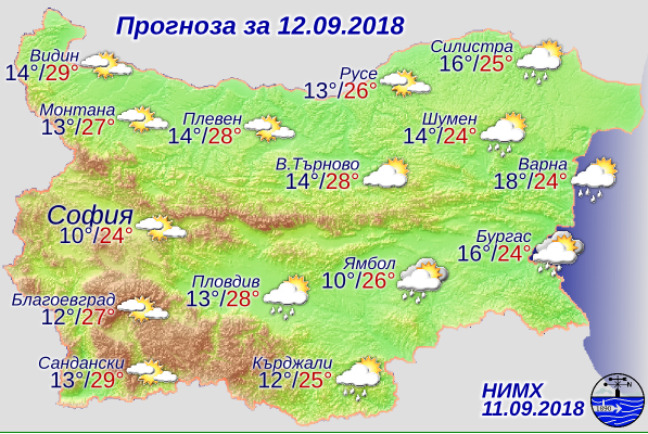 В сряда времето ще бъде предимно слънчево, но след обяд над източните и планинските райони облачността ще се увеличи, ще е по-често значителна и на места там ще има краткотрайни валежи. Ще духа слаб, в източната половина от страната - до умерен вятър от север-североизток. Максималните температури ще са между 23 и 28 градуса. Такава е прогнозата за времето на Националния институт по метеорология и хидрология (НИМХ). Атмосферното налягане ще се понижи, но ще остане по-високо от средното за месеца.