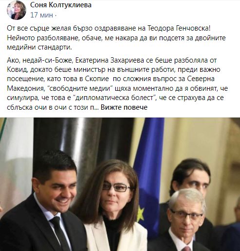 "Тези, които бяха безжалостни към Бойко Борисов и министрите му, са милозливи към Кирил Петков и министрите му. И това се нарича обективна журналистика." Това написа в профила си във "Фейсбук" журналистката Соня Колтуклиева. "Ако, недай-си-Боже, Екатерина Захариева се беше разболяла от Ковид, докато беше министър на външните работи, преди важно посещение, като това в Скопие по сложния въпрос за Северна Македония, “свободните медии” щяха моментално да я обвинят, че симулира, че това е “дипломатическа болест”, че се страхува да се сблъска очи в очи с този парещ международен проблем", пояснява тя.