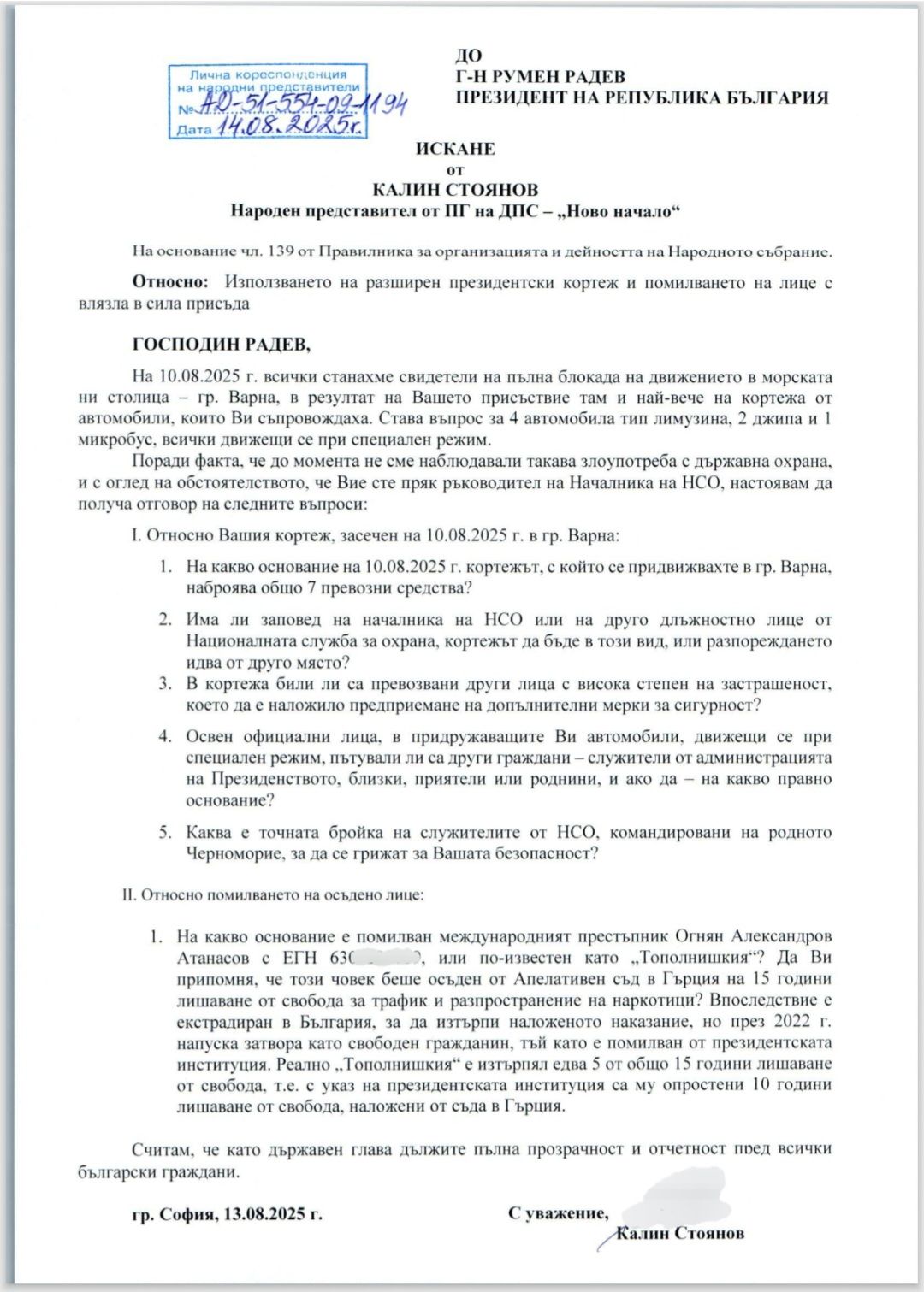 СТАВА НАПЕЧЕНО: Калин Стоянов ПРИТИСНА Радев за кортежа (ОФИЦИАЛЕН ДОКУМЕНТ)