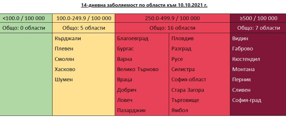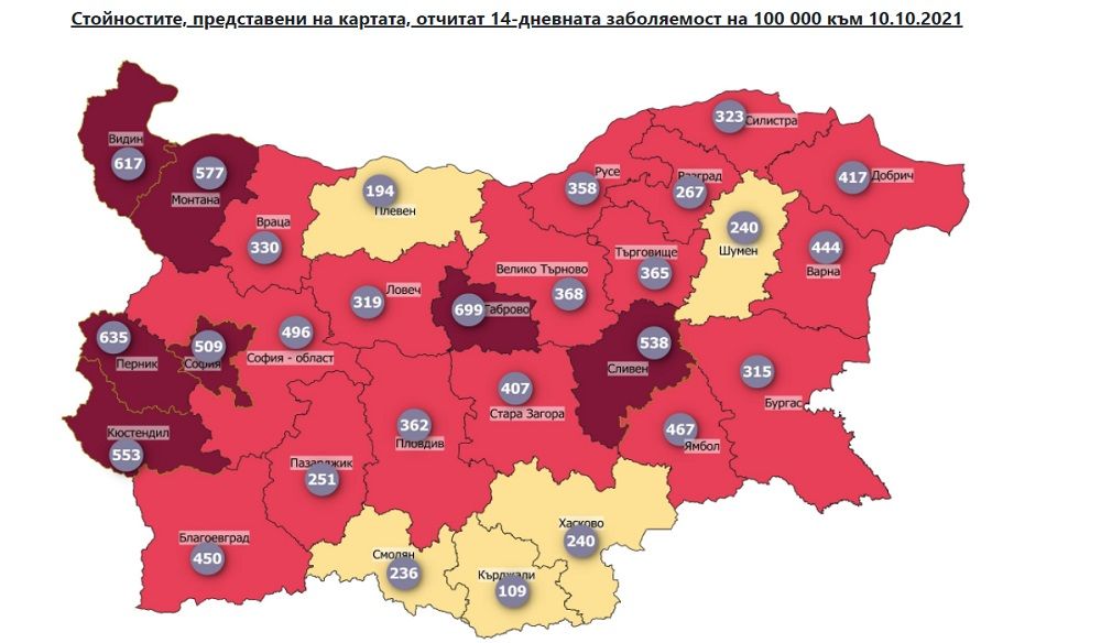 Средната заболеваемост за страната на 14-дневна база пък вече е 448 души на 100 000 население.