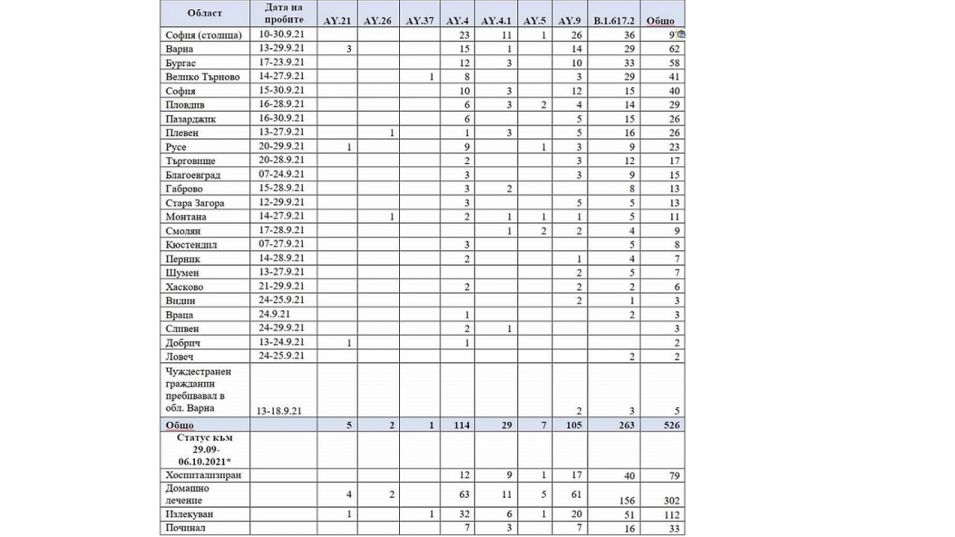 В НЦЗПБ чрез целогеномно секвениране успешно са анализирани 526 клинични проби със SARS-CoV-2. При всички тях се установи вирусен вариант Делта, който според СЗО е причислен към вариантите с повишено значение за общественото здраве.