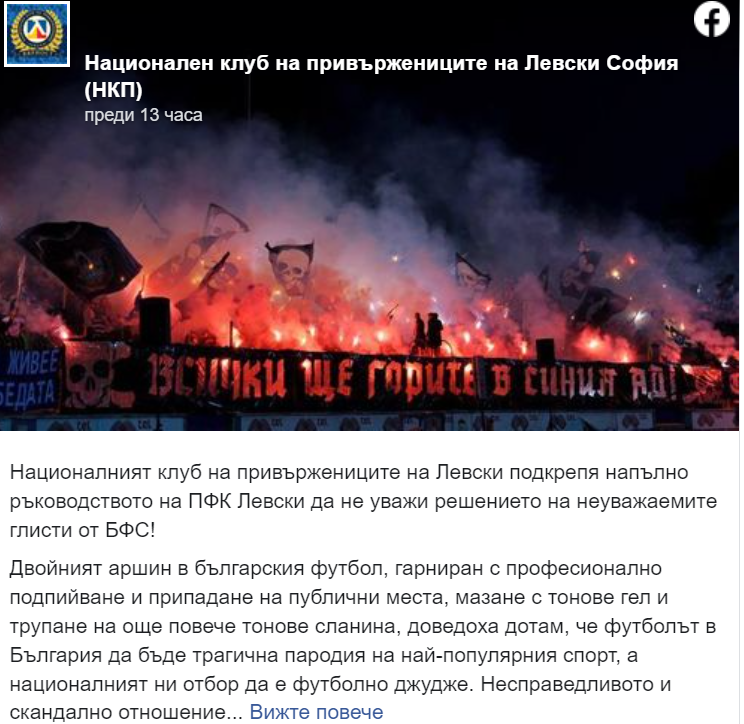 "Националният клуб на привържениците на Левски подкрепя напълно ръководството на ПФК Левски да не уважи решението на неуважаемите глисти от БФС!