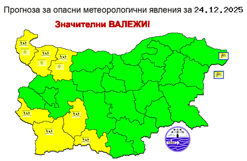 На Коледа ще е облачно с повсеместни, на места значителни валежи: в Западна и Северна България от сняг, в Горнотракийската низина и по Черноморието – от дъжд. Ще се образува снежна покривка, а по планинските проходи в Стара планина ще има снежни виелици и ще се образуват и навявания. С умерен, в Източна България и силен североизточен вятър ще продължи да нахлува студен въздух и температурите ще се понижават. По самото нахлуване на студения въздух в Централна Северна България са възможни поледици. Максималните температури ще са от минус 4° – плюс 1° в северозападната част от страната до 2° – 7° в Южна България и крайните източни райони.