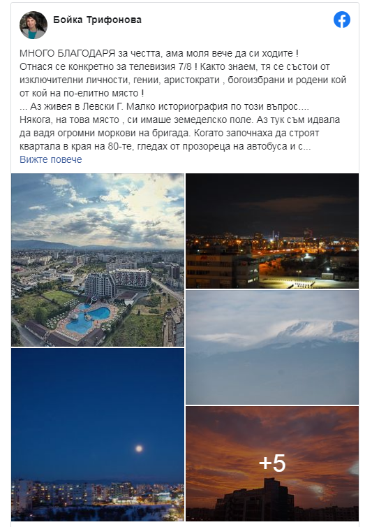 "Извинете ме, господин Трифонов ! Вие сте новодошъл и при това сте само наемател тук ! Как не ви е срам да създавате долнопробен публичен имидж на квартала, в който живея аз и още 40 000 души ?! Вие сваляте цената на имотите ни ! Вие отблъсквате хората, които биха дошли да обновяват квартала! Вие ни вредите в такава степен, каквато е недопустимо !!! ...И защо ? Защото сте роден в Бъкингамският дворец и за Вас Левски Г е под Вашето ниво ?!..... А къде сте роден, всъщност ?..“, пише във Фейсбук страницата си Бойка Трифонова.