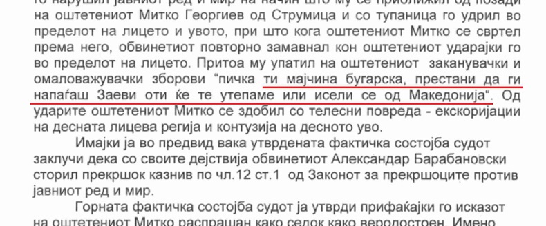 Съдът в Струмица наскоро осъди местен за удари срещу друг местен. Наглед дребна свада. „Дребната“ подробност обаче е, че тупаниците идват с викове „Пи*ка ти майчина бугарска, престани да ги нападаш Заеви, защото ще те утепаме, или се изсели от Македония“. Цветистите думички са записани в присъдата на струмишкия съд и са дошли от устата на Александър Барабановски. Потърпевшият е Митко Георгиев.