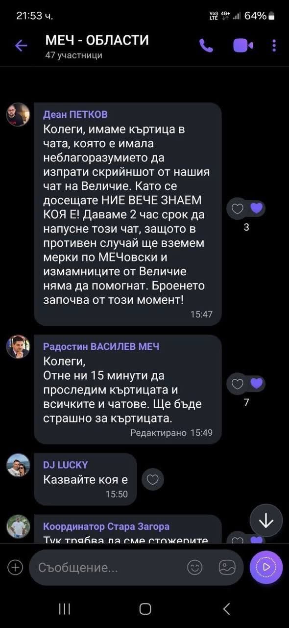Къртицата, видно е от скрийншота долу, си е навлякла гнева на Радостин Василев и присъдружието му. Завалели са заплахи за незабавно напускане на чата, в противен случай щели да бъдат взети "мерки по МЕЧовски", каквото и да означава това. "Ще бъде страшно за къртицата", заканва се дори самият Руди Гела.