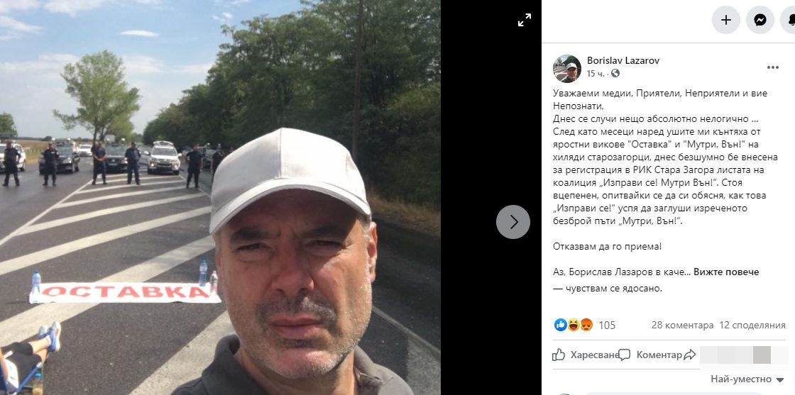 Аз, Борислав Лазаров в качеството си на един от хилядите активни участници в летните Протести за морал в политиката, заявявам ясно и категорично, че НЕ ПОДКРЕПЯМ изготвената от г-жa Мая Манолова листа за народни представители за 27 МИР - Стара Загора на коалиция „Изправи се! Мутри Вън!“!
