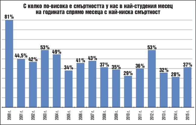 Като се сравнят максимумите и минимумите в траурната статистика след 2000 г., се вижда, че разликата между тях е средно 45 процента. За този период най-малко е било януарското увеличение на смъртността през 2014 г. - 28%. А най-драстично през 2000 г. - 81%, като в абсолютни стойности разликата между починалите през януари и септември е 6255 души в полза на зимния месец. През конкретната година той е средно с 4 градуса по-мразовит от нормата. Най-много страдат от студа хипертониците.