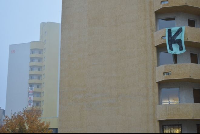 От няколко други прозореца на студентски общежития бяха спуснати и транспаранти с различни надписи.