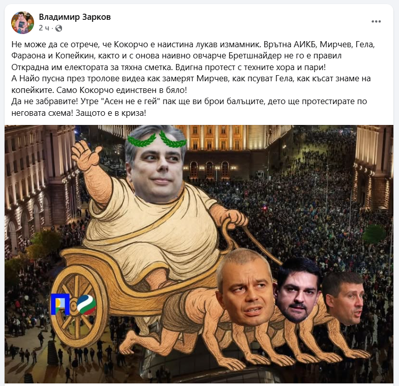 СХЕМАТА Е СЛЕДНАТА: Кокорчо краде електората на Възраждане, МЕЧ и Величие, а Найо през троловете замеря Мирчев, Гела и копейките. Утре пак ще се броят балъците...