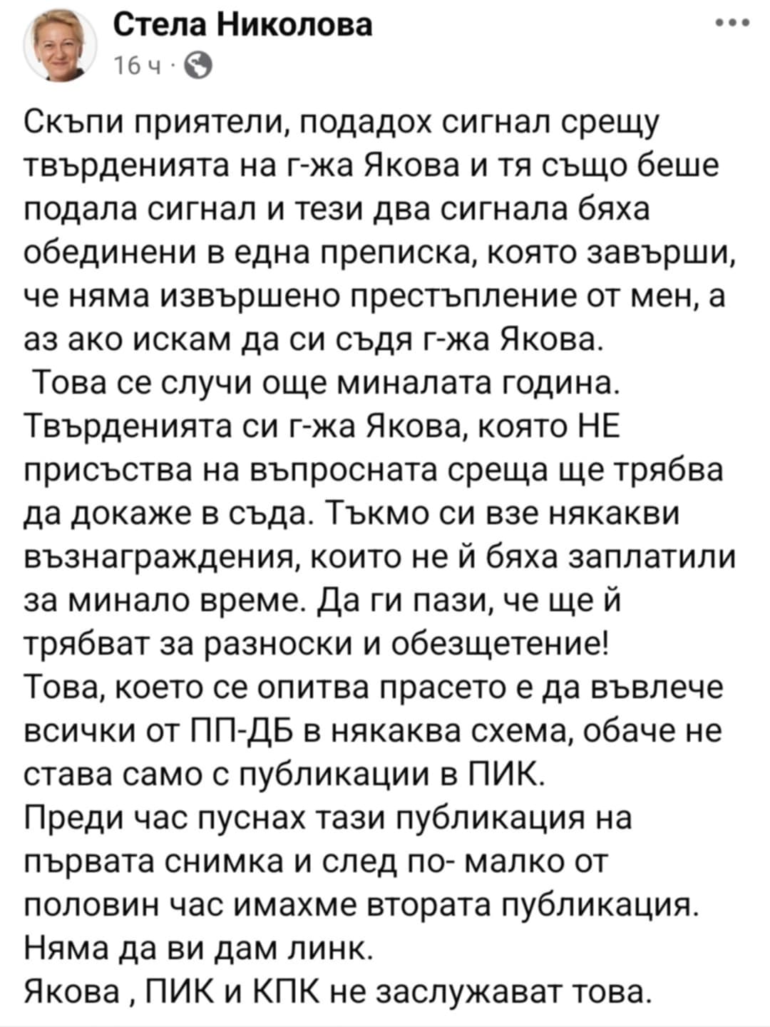 След разкритието в ПИК, Стела Николова реагира с публикация в своя профил във Фейсбук. В него тя отправя персонални нападки към Биляна Якова-Атанасова. И нещо повече - отправя заплахи за съд и внушения за “възнаграждения“, които тя трябвало да си пази.