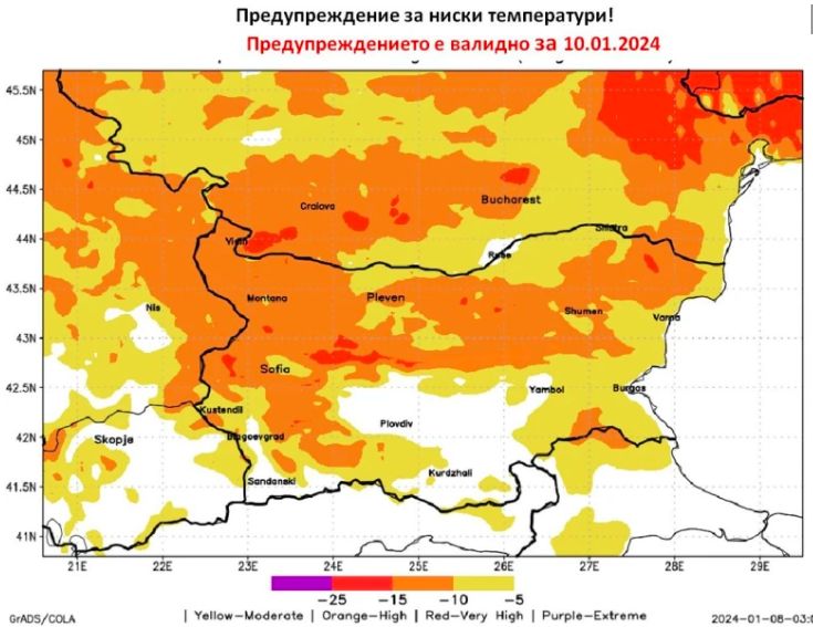 Утре, 10 януари, очакваме ниски температури, като стойностите на термометъра в много райони ще се понижат под минус 10 градуса по Целзий. Поради очакваните ниски температури е издадено и предупреждение. Картата е базирана на регионалния числен модел SPM и показва районите, където температурите ще са най-ниски. Районите с бял цвят ще са по-безопасни и градусите там ще са около минус 5 градуса по Целзий, съобщават от Meteo Balkans.