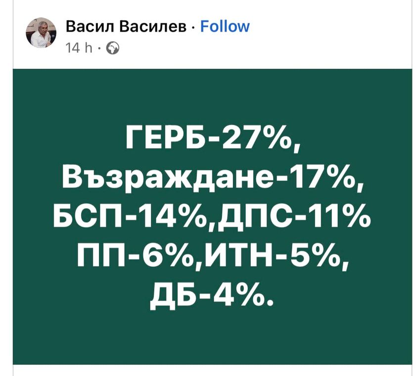 Един от най-доверените хора на Румен Радев - бизнесменът Васил Велев, публикува любопитна социология за предстоящите предсрочни парламентарни избори на 2 октомври. Според него ГЕРБ ще спечели убедително, като ще вземе 27% от гласовете на избирателите. Социологията на Василев показва, че втора сила ще е "Възраждане" със 17%, трета - БСП с 14%. Четвъртото място ще е за ДПС с 11%, а "Продължаваме промяната" ще е едва пета политическа сила със скромните 6%. Според Васил Василев в парламента влизат още ИТН с 5% и ДБ с 4%.