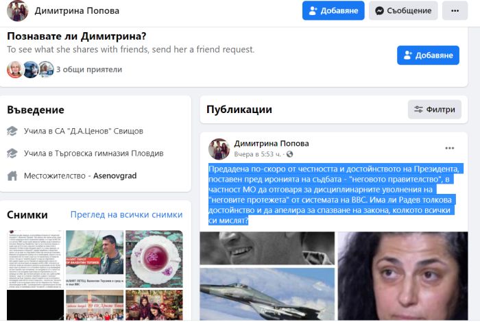 „Предадена по-скоро от честността и достойнството на Президента, поставен пред иронията на съдбата - "неговото правителство", в частност МО да отговаря за дисциплинарните уволнения на "неговите протежета" от системата на ВВС. Има ли Радев толкова достойнство и да апелира за спазване на закона, колкото всички си мислят?“