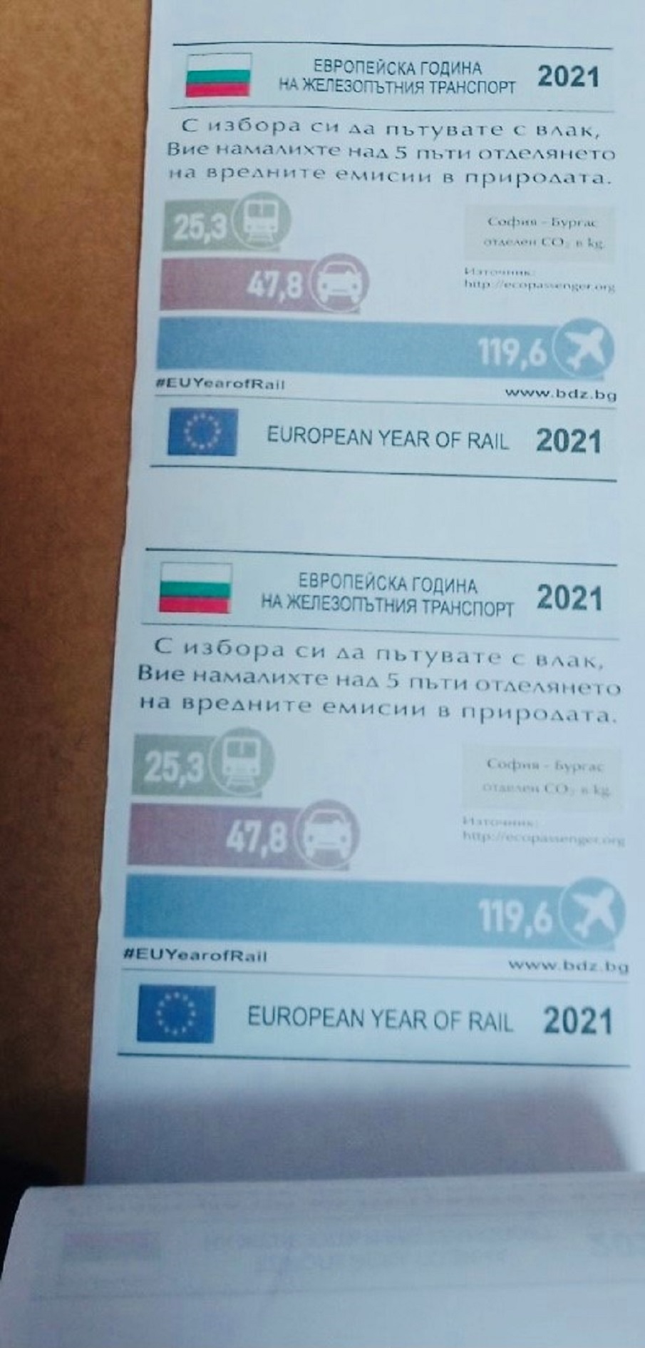 Във връзка с популяризиране на екологичния ефект на железницата, която е много по-щадяща околната среда при отделянето на вредни емисии в сравнение с другите видове транспорт, БДЖ организира информационна кампания „Екологичното пътуване“ чрез визуализиране на данни за отделянето на вредни емисии от различните видове транспорт при преминаване на конкретен маршрут. Тези данни клиентите на БДЖ могат да намерят на гърба на своите билети за пътуване с влак, както и на специално създадения за целта раздел в сайта на дружеството https://www.bdz.bg/bg/a/eco-passenger .