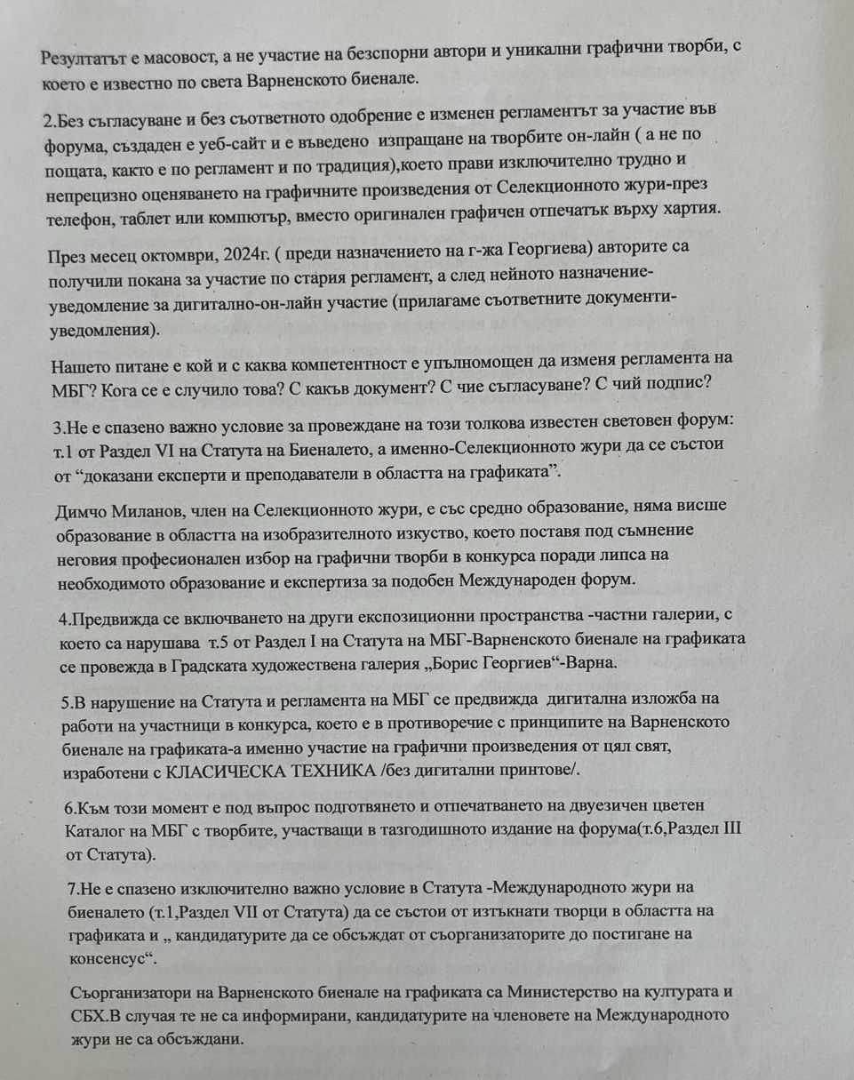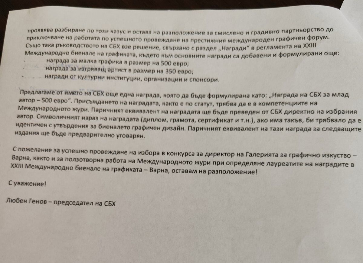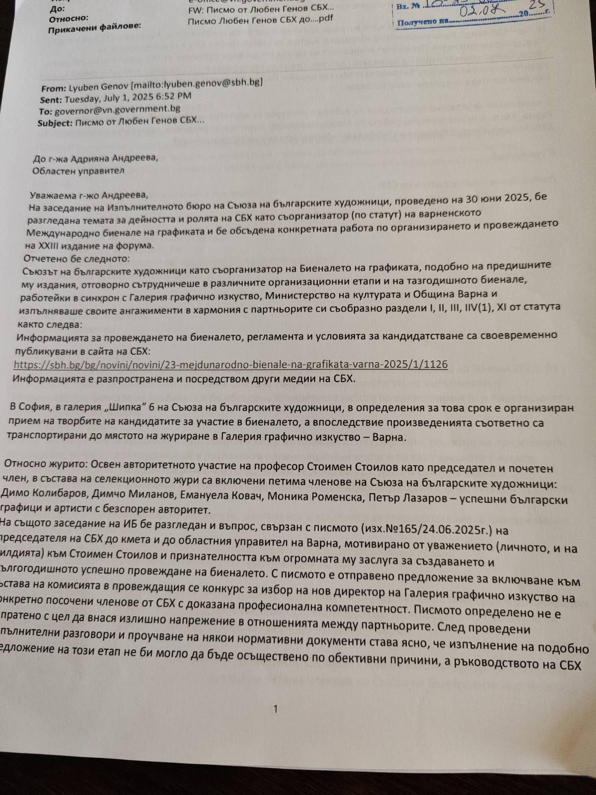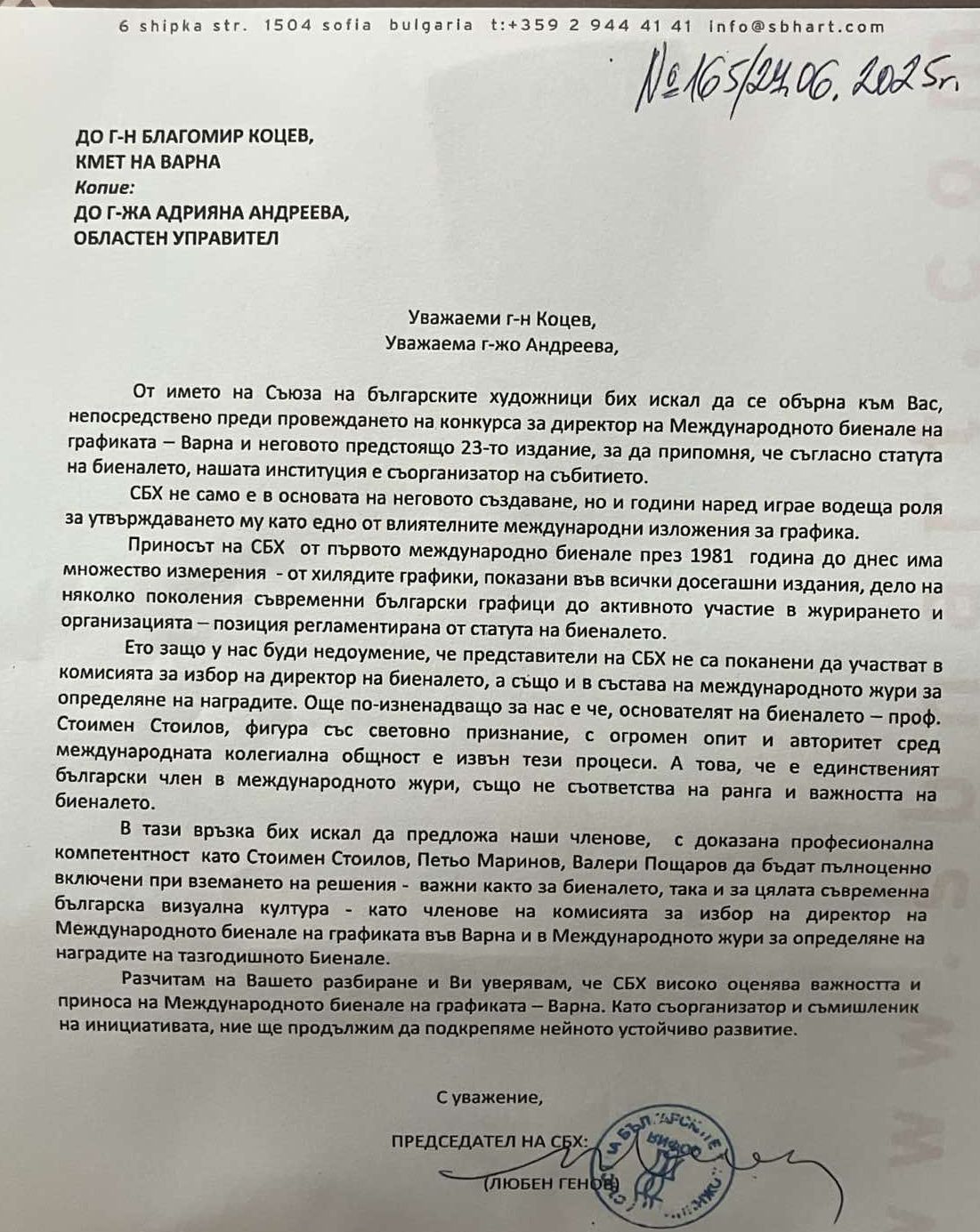 Със свое писмо председателят на Съюза на художниците Любен Генов, изпратено до ПъПъ варненския кмет Благомир Коцев, както и до Областния управител на Варна, изразява недоумение защо не са допуснати в конкурса за избор на директор на биеналето, както и защо не са включени в международното жури на Биеналето. Писмото е от 24 юни т.г.: