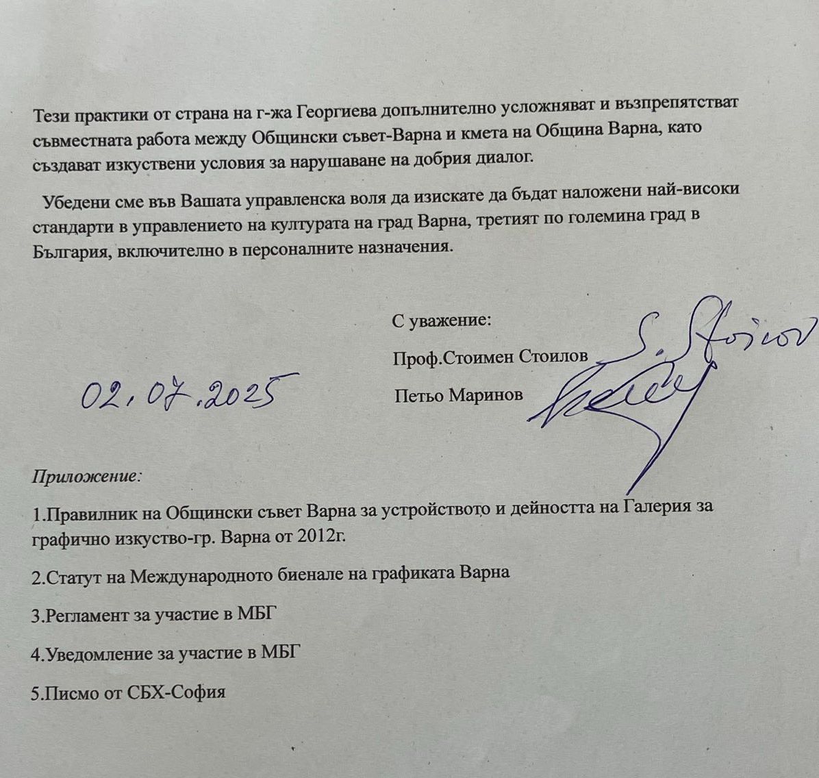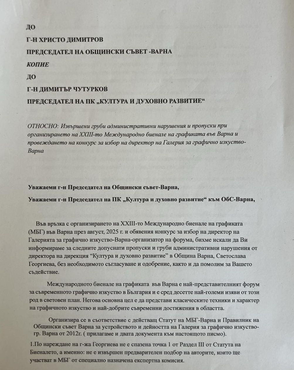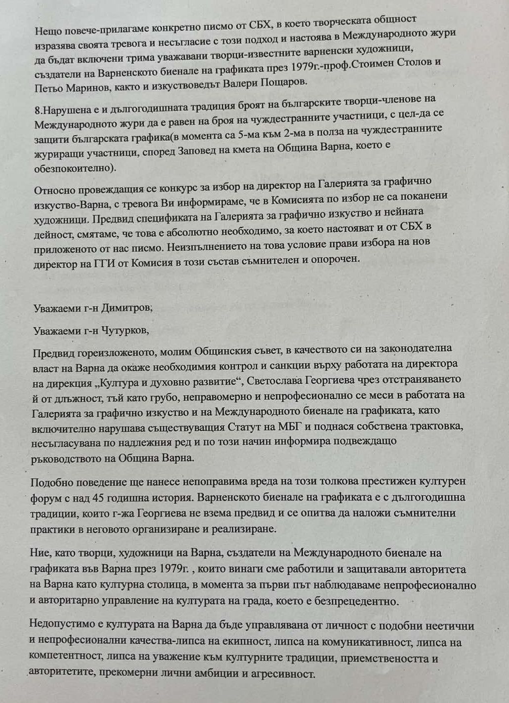 Със свое писмо председателят на Съюза на художниците Любен Генов, изпратено до ПъПъ варненския кмет Благомир Коцев, както и до Областния управител на Варна, изразява недоумение защо не са допуснати в конкурса за избор на директор на биеналето, както и защо не са включени в международното жури на Биеналето. Писмото е от 24 юни т.г.: