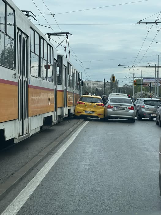 Нов инцидент с участието на трамвай за последното денонощие. Таксиметрова кола остана заклещена между трамвай и друг автомобил в сряда сутрин, когато трафикът обичайно е натоварен.