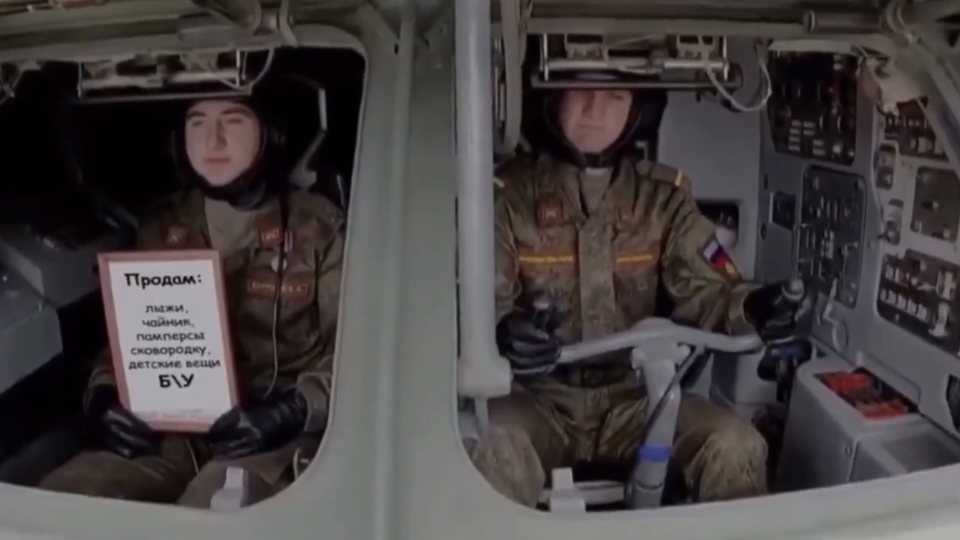 А в един от танковете се вижда войник, който държи табела с надпис: “Продавам ски, чайник, памперси, тиган, детски вещи”.