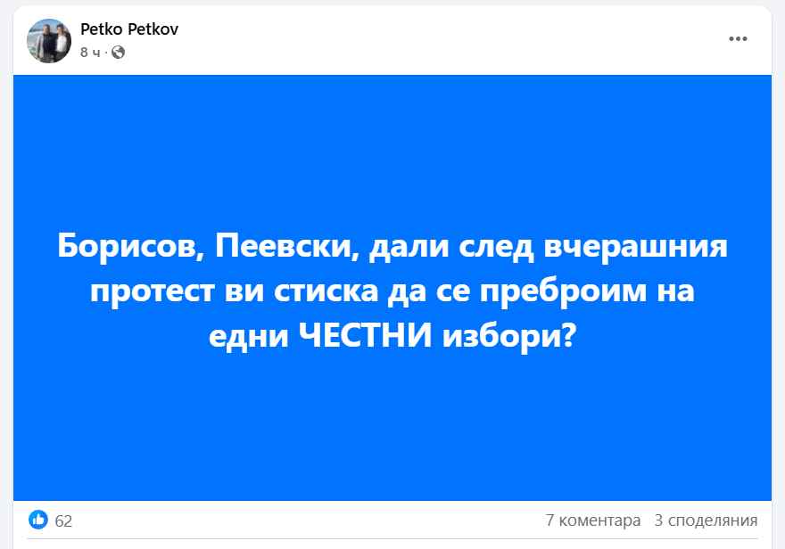 "Борисов, Пеевски, дали след вчерашния протест ви стиска да се преброи на едни ЧЕСТНИ избори?", запита татко Петко от своята лична трибуна - Фейсбук, понеже сега не е както преди и на митингите на "Промяната" мегафонът вече изобщо не достига до него.