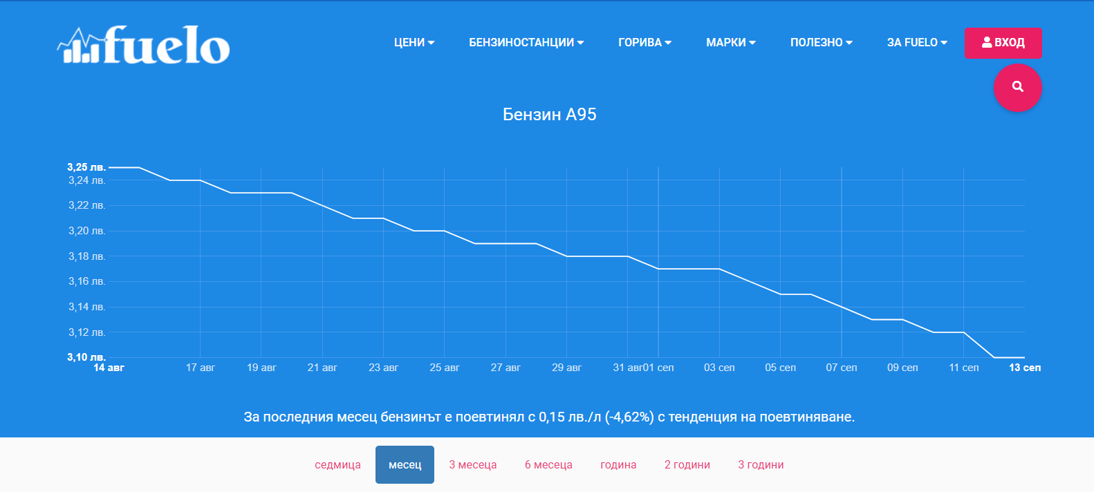 Масовият бензин А-95 е поевтинял от 13 август до днес с точно 16 стотинки за литър или с почти 5%.