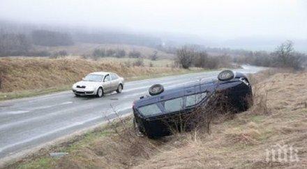 По първоначална информация товарен автомобил „Мерцедес“, управляван от 19-годишен младеж, се е преобърнал в крайпътна нива.