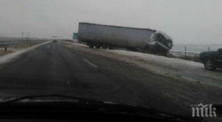 Два ТИР-а са закъсали по пътя Разград-Попово, в участъка след село Благоево към Ломци. Това съобщиха от Областната дирекция на МВР.