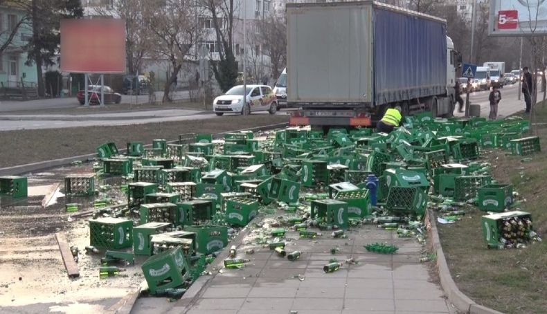 ТИР разсипа 30 палети с каси бира в Шумен. Инцидентът стана на натоварено кръстовище в пиков час, съобщава БТВ.