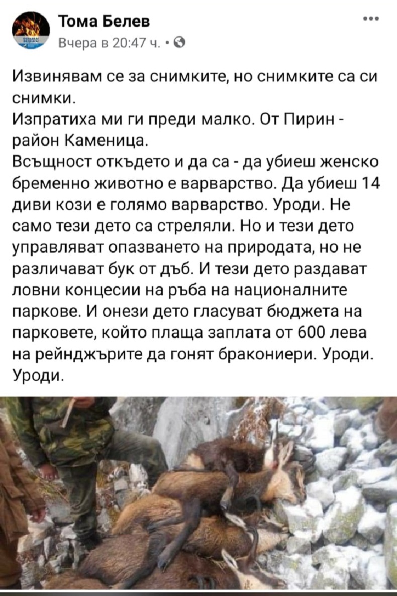 Снимки със съмнителна автентичност на 14 убити диви кози се разпространиха снощи в социалните мрежи. Твърдението е, че снимките са направени в Национален парк Пирин. Снимките ги пусна екологът Това Белев.