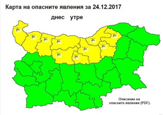 Топло за сезона ще бъде времето днес. Облачността ще е променлива, по-често значителна и главно през нощта в планините ще има слаби превалявания от сняг. Ще духа умерен, в Дунавската равнина и силен запад-северозападен вятър. Температурите ще се повишат: минималните ще са между минус 4° и 1°, максималните – между 6° и 11°. В нощта на Рождество Христово вятърът ще отслабне, а облачността ще намалее до предимно ясно. Такава е прогнозата за времето на Националния институт по метеорология и хидрология. Атмосферното налягане ще се задържи по-високо от средното за декември.