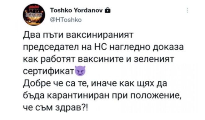 "Два пъти ваксинираният председател на НС нагледно доказа как работят ваксините и "зеленият сертификат". Добре че са те, иначе как щях да бъда карантиниран при положение, че съм здрав?!", написа в профила си в Туитър Тошко Йорданов.