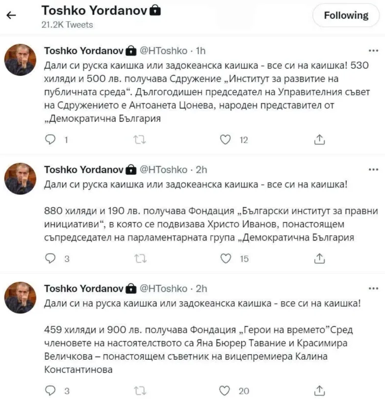 В поредица от съобщения той дава примери с фондации, сдружения и медии, които се финансират от ПП и ДБ, за да прокарват определена идеология.