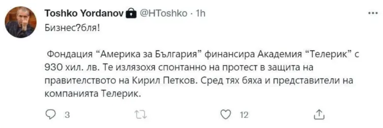 Според данните на представителя на ИТН, фондация "Америка за България" финансира академия "Телерик" с 930 000 лева, а на протеста в защита на кабинета на Кирил Петков е имало хора и на компанията.