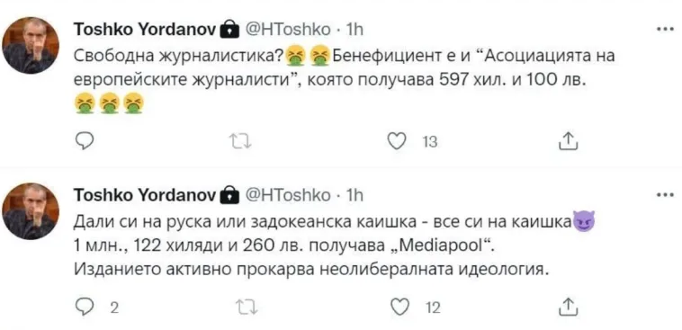 Според информацията на Йорданов, "Асоциацията на европейските журналисти" взима близо 600 000 лева, а Mediapool над 1 млн 200 хил. лева. Сайтът "Клуб Z" за публикации с безнес насоченост получава 170 000 лева.