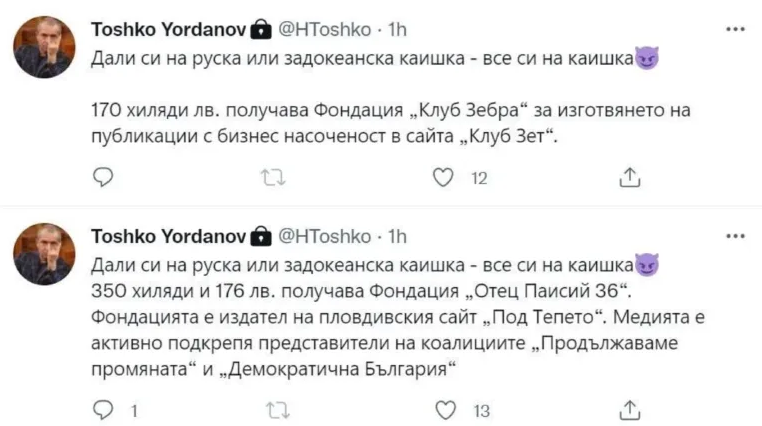 Фондация "Отец Паисий 36", която издава пловдивския сайт "Под тепето" и активно подкрепя ПП и ДБ е взела над 350 000 лева, пише още Тошко Йорданов.