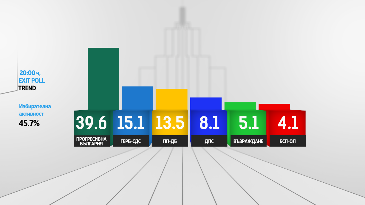"Тренд" към 20.00 часа: "Прогресивна България" печели с 39,6%, ГЕРБ - 15,1%