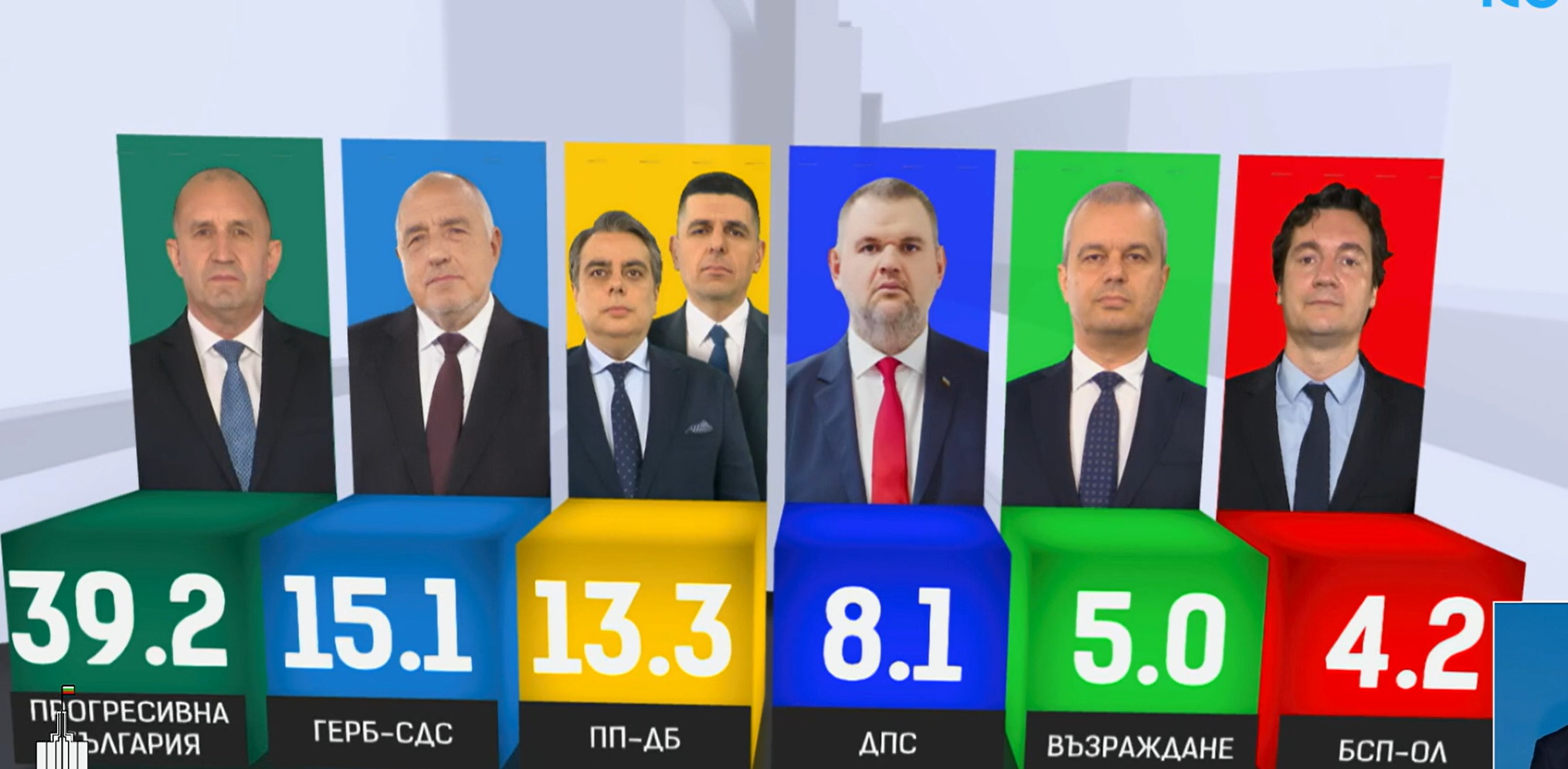 Първи резултати дава социологическа агенция Тренд след края на изборния ден. Според екзит пола към 19.00 часа 39,2% са гласували за "Прогресивна България", 15,1% за ГЕРБ, ППДБ взимат 13,3%, а за ДПС са дали вота си 8,1% от гласоподавателите.