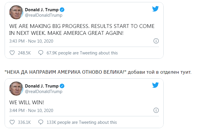 Президентът на САЩ Доналд Тръмп заяви във вторник в Туитър, че очаква победа, но без допълнителни разяснения дали победата ще бъде постигната в битката на страната с пандемията от коронавирус или в опита му да оспори резултатите от президентските избори, съобщава БНР.