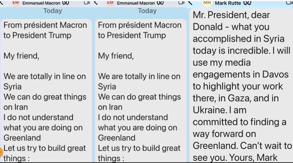 "Г-н Президент, скъпи Доналд, Това, което постигна днес в Сирия, е невероятно. Ще използвам медийните си изяви в Давос, за да изтъкна работата ти там, в Газа и в Украйна. Ангажиран съм с намирането на път напред по въпроса за Гренландия. Нямам търпение да те видя. Твой, Марк", гласи то.