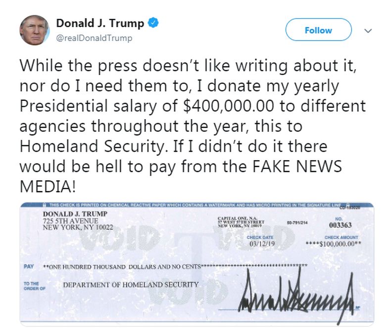 Президентът на Съединените щати Доналд Тръмп дари 100 000 долара на Департамента за вътрешна сигурност. Това съобщи самият той в Туитър.