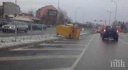 СИЛНА БУРЯ! Вятърът "захвърли" контейнер за смет насред булевард във Варна